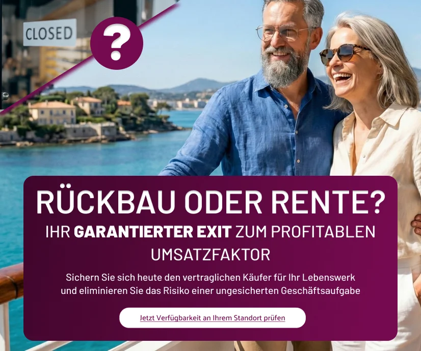 Wir geben Ihnen die Sicherheit, die der freie Markt Ihnen nicht mehr bieten kann: Eine vertragliche Kaufgarantie zum Wunsch-Stichtag. Dabei fixieren wir bereits heute den profitablen Umsatzfaktor für Ihre finale Auszahlung. Kein Rückbau, kein Preisrisiko, volle Planungssicherheit.